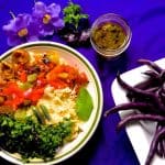 You may need to do some multi-tasking here, making the sauce and the dressing while the vegetables are roasting, setting the couscous and side to cook while you get the beans and herbs ready.
